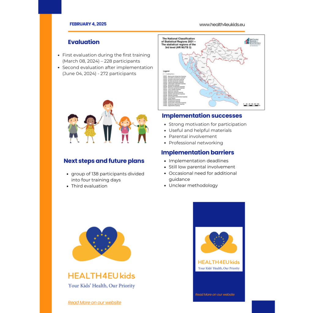Health4EUKids -Your kid's health our priority!The “HEALTH4EUkids” Joint Action aims to implement health promotion and prevention strategies for child obesity across European countries. It seeks to share best practices and research findings, particularly focusing on the initiatives Grunau Moves from Germany and Smart Family from Finland. The project involves knowledge transfer, cooperation between member states, policy development, and the promotion of healthy lifestyles in families and communities. Its goal is to prevent childhood obesity, increase physical activity and healthy diet, and ensure the sustainability and transferability of successful practices to other member states.